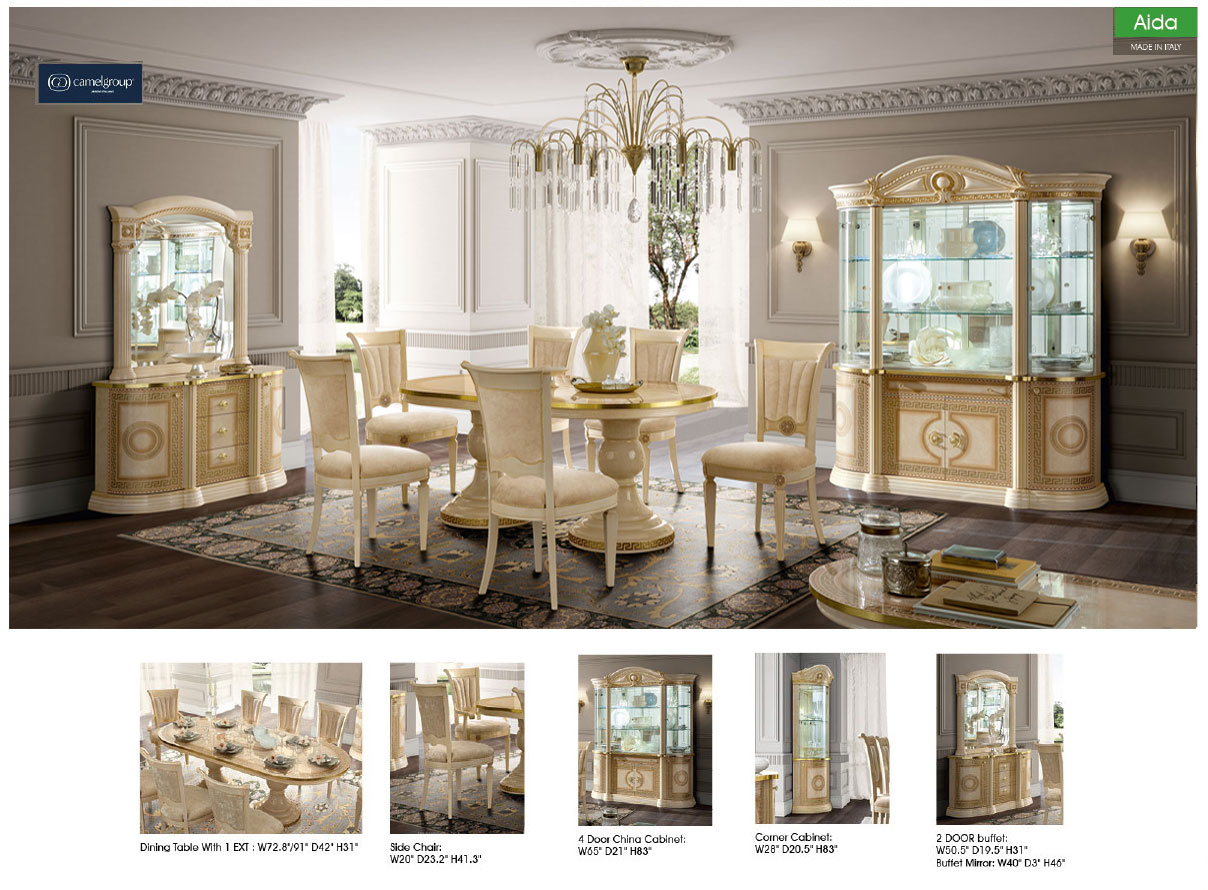This luxurious dining room set embodies timeless elegance and refined European-inspired design. Finished in warm, light tones with rich gold detailing, the collection creates a sophisticated and harmonious atmosphere. The round dining table serves as an inviting centerpiece, paired with upholstered chairs that offer both comfort and classic style. Coordinating storage pieces, including a display cabinet and sideboard with mirror, enhance the room with both beauty and functionality. Perfect for formal dining spaces, this set delivers a graceful balance of elegance, craftsmanship, and everyday practicality.